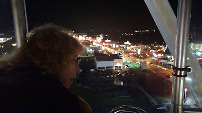 | Our last night we decided to take the ferris wheel at night. They light up the water towers at night. |